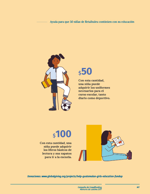 The 2017 Report reserves a special section for the new crowdfunding project launched this year. The campaign consists of granting scholarships so that Guatemalan girls in difficult situations can continue going to school.